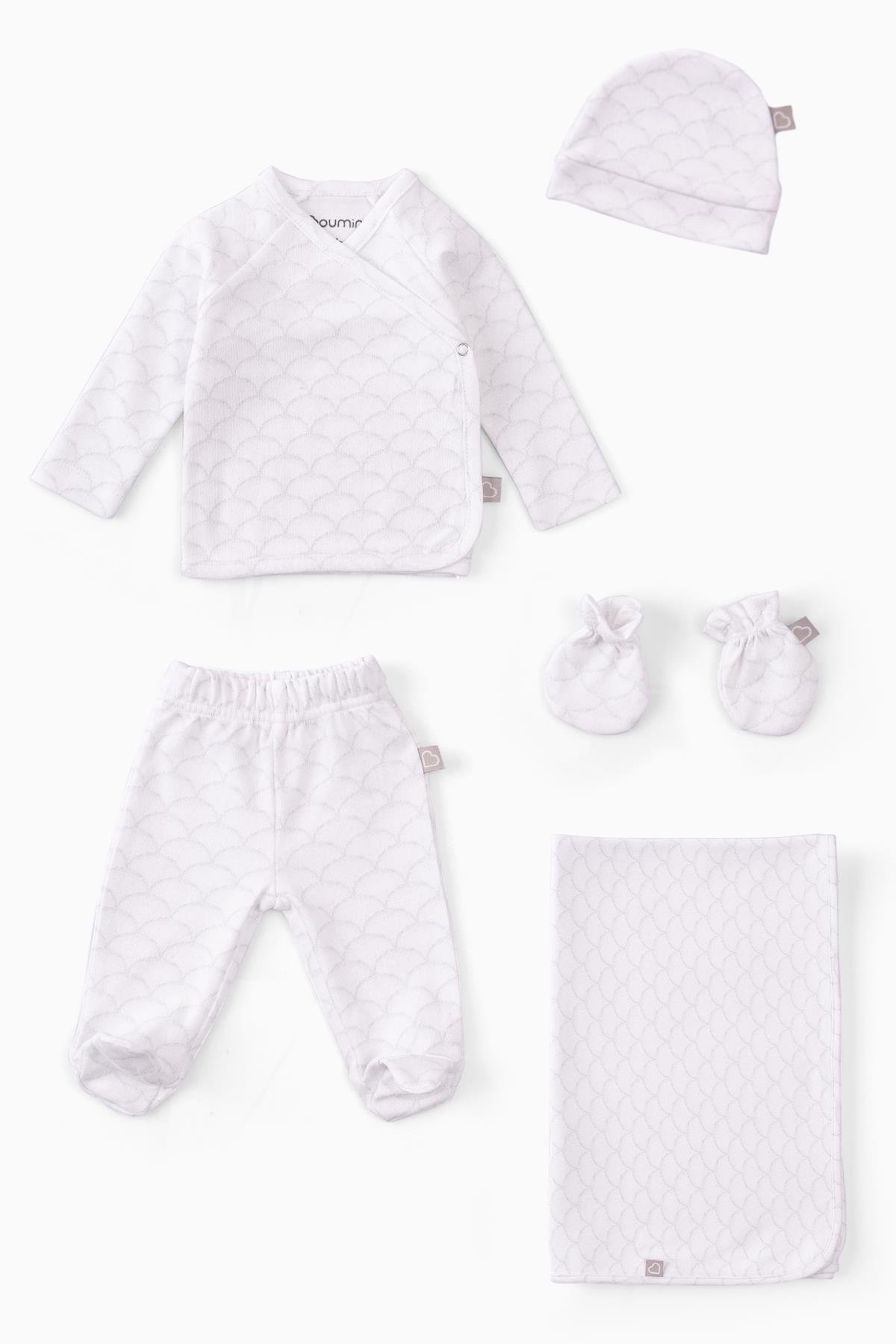 Boumini %100 Pamuk Bebek 5'li Hastane Çıkış Seti Büyük Dalga Beyaz Özellikleri :
